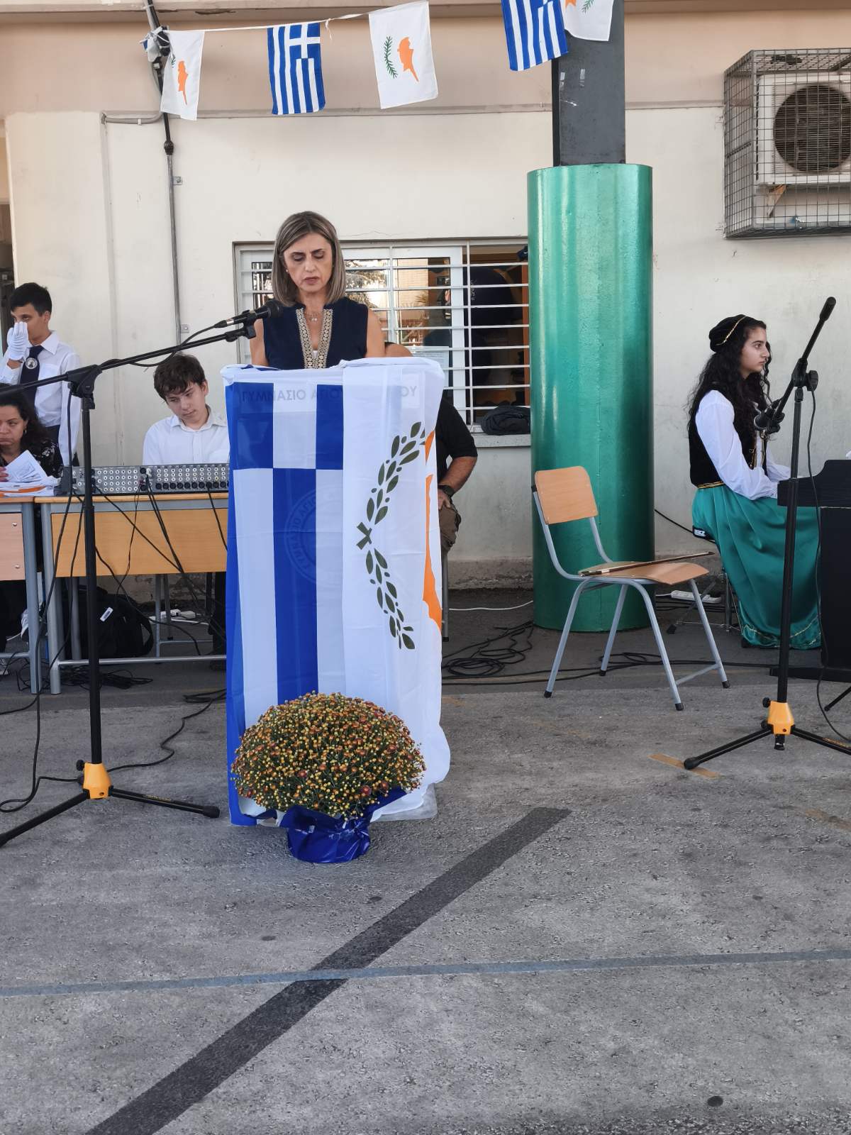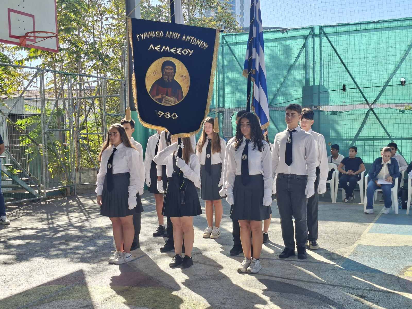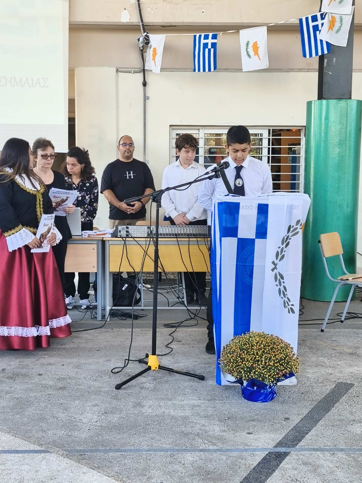 Η Διευθύντρια του Σχολείου παρέδωσε μετά από σύντομη προσφώνηση, το Λάβαρο και τις Σημαίες στους Σημαιοφόρους του σχολείου οι οποίοι στη συνέχεια παρέλασαν μπροστά από τους μαθητές, καθηγητές και γονείς που παρευρίσκονταν στην εκδήλωση.