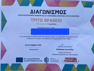 Το σχολείο μας με ομάδα μαθητών υπό την επίβλεψη του καθηγητή Τεχνολογίας κ. Νεόφυτου Βασιλείου συμμετείχε στη «Δράση καλλιτεχνικής δημιουργίας: Οι «Ευρωπαϊκές Αποστολές» για την αειφορία» όπου και κατέκτησε την 3η θέση στην κατηγορία Γυμνασίων με την κατασκευή με θέμα: "ζώντας έξυπνα … σε μια έξυπνη πόλη".
